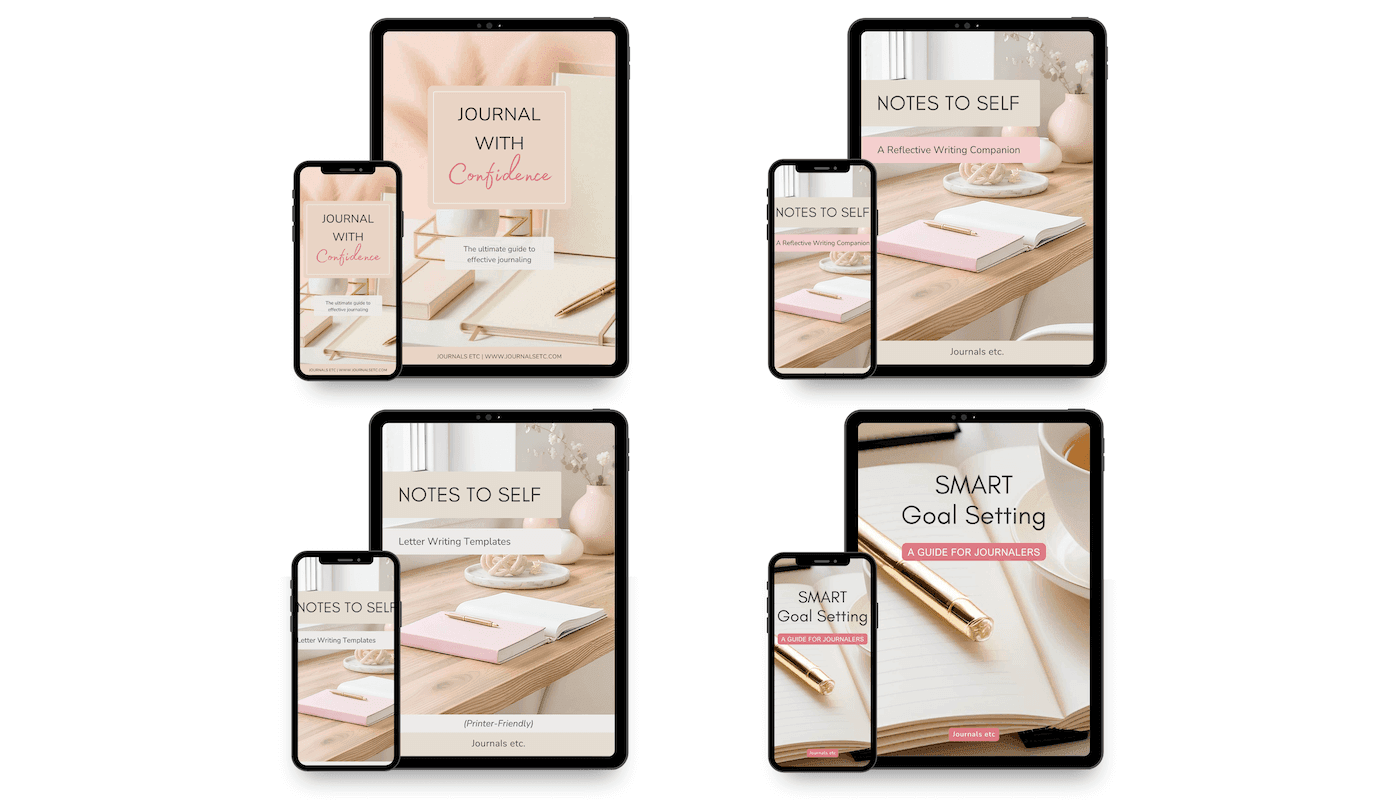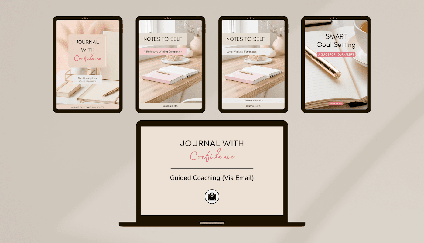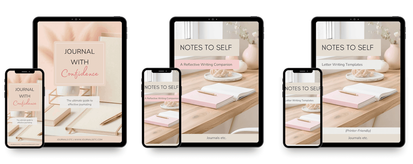 Three premium digital guides, including our comprehensive 94-page journaling guide (with a digital journal included), our 72-page reflective writing companion, and a separate set of reflective letter-writing templates, all designed to provide the essential tips, techniques, and space needed to get the most out of journaling.